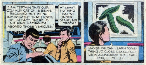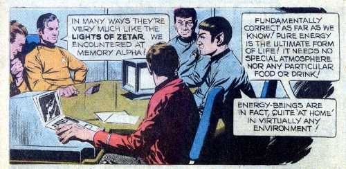 ![]() ![]() Their appetites sated, the energy beings head back into space and move away at extreme speed. The landing party quickly beam back up to the ship, and the Enterprise pursues them. Kirk calls a meeting in the briefing room with the command staff. "All right, Mr. Spock so we're right behind them!" the Captain says. "The question is where are they leading us?" Spock tells the Captain that he is unsure of their destination, but that he has determined that the energy beings are ahead of human kind on the evolutionary scale by two million years. "In many ways they're very much like the Lights of Zetar we encountered at Memory Alpha!" Kirk says. "Fundamentally correct as far as we know!" replies Spock. "Pure energy is the ultimate form of life. It needs no special atmosphere nor any particular food or drink! Energy-beings are in fact, quite 'at home' in virtually any environment!"