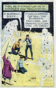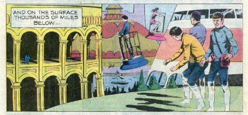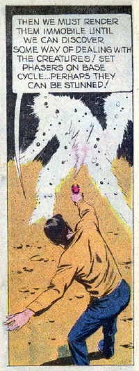 ![]() ![]() Back on the Enterprise, Spock locates a suitable class 'M' planet, and Zhyopha agrees to the location. Kirk beams down to the planet, and is promptly attacked by large, purple squid-like creatures that live there. He is able to quickly kill them with his phaser. At that moment his opponent, one of the energy beings, arrives on the surface. The creature quickly absorbs the bodies of the purple squids that Kirk killed, and then begins absorbing all energy sources in sight. The Captain is able to hide himself and watch from afar. "The more the alien consumes, the greater his need!" thinks Kirk to himself. He calls the Enterprise and asks Zhyopha to dispatch the remaining energy creatures to the planetoid surface. "Your Captain is a fool!" Zhyopha says. The other energy creatures soon reach the planet. They consume every energy source available. When there is nothing left on the surface but rock, they begin to starve. "They're frantic!" Kirk calls back up to the ship. "Do you hear, Zhyopha? You've played your last card and lost! There's nothing left here but rock. They're starving to death, Zhyopha, starving!" (No reason is given why they don't simply fly through space to get to another energy source like they did at Beta Niobe III.) The deprived energy beings collide with one another, destroying themselves completely! Later on the Enterprise, a defeated Zhyopha is taken to the brig, and Kirk orders the ship out of orbit at warp factor 2.