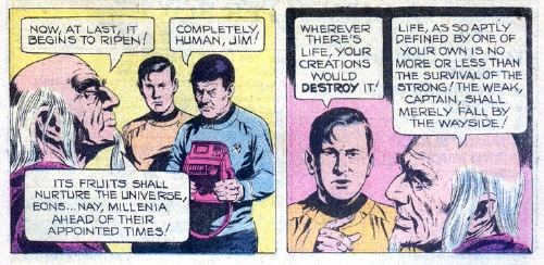 ![]() Back on the bridge, the crew is shocked to see a tree, hundreds of miles high, rising from the surface of the planet! The huge tree is covered with more of the pod-like growths that spawned the alien beings. Kirk, Spock and McCoy beam down to the surface of the planet, at the base of the massive growth. There, they find the three energy creatures, along with a very old man. "I am Zhyopha!" he says. "Lone inhabitant of this, the first world in the first galaxy of the first universe! Neither born nor fated to die, my existence is eternal! It was I who seeded this - the true tree of life! Multiply every grain of sand in the galaxy by every particle of dust by every drop of water, and you still will not have calculated how long the tree has grown! Now, at last, it begins to ripen!" McCoy takes a tricorder reading of Zhyopha, and discovers that he is completely human. "Wherever there's life, your creations would destroy it!" Kirk yells. (This is an inconsistency in the story line, as the energy beings specifically went out of their way to avoid harming any living creatures on Beta Niobe III.) "Life, as so aptly defined by one of your own is no more or less than the survival of the strong!" Zhyopha says. "The weak, Captain, shall merely fall by the wayside."