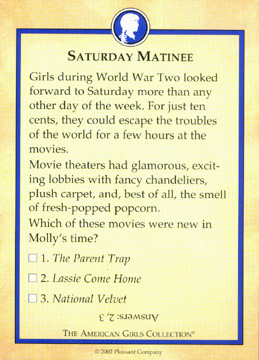 To coincide with the release of the Molly McIntire TV-Movie, two new card sets will be produced for release in August of 2006. Molly will get a movie cards set of 10 cards and Molly's best friend Emily Bennett will get a set just like Nellie and Elizabeth's, featuring 10 cards with illustrations by Nick Backes taken from the new book, Brave Emily.