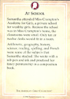 that had come out for these girls in the previous two years. The 2002 series card set for each of the first seven girls, Samantha, Molly, Kirsten, Felicity, Addy, Josefina and Kit included 16 cards, one unnumbered checklist card and 3 stickers, while Kaya's 2002 series card set included 30 cards, one unnumbered checklist card and 5 stickers. The 2002 Series would be Sam's third card set.