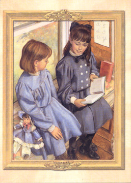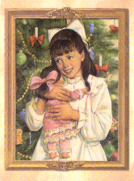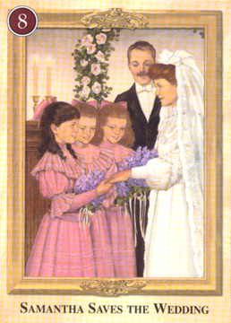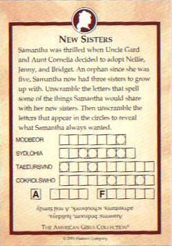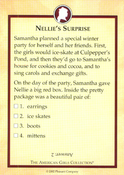 In late August 2004, the so-called "Trading Card Mini-Albums" became available. This album collection was a means of collecting and displaying the cards for the first eight American Girls. Each mini album holds up to 30 trading cards. The album set also included a three-sided frame for displaying favorite cards on a desk, nightstand, or shelf, and also included a free special-edition Samantha & Nellie trading card. This special edition card bears the copyright date of 2004 on the back and both sides of it are shown on the right. The card is numbered 17 and thus might be considered part of the 2002 Series.